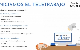 Estimados compañeros, Siguiendo las recomendaciones sanitarias, el equipo técnico de Fundación AHUCE retoman la fórmula de teletrabajo. De forma excepcional, individualizada y siguiendo criterios clínicos y sociales se atenderá presencialmente a aquellas personas que lo necesiten [...]